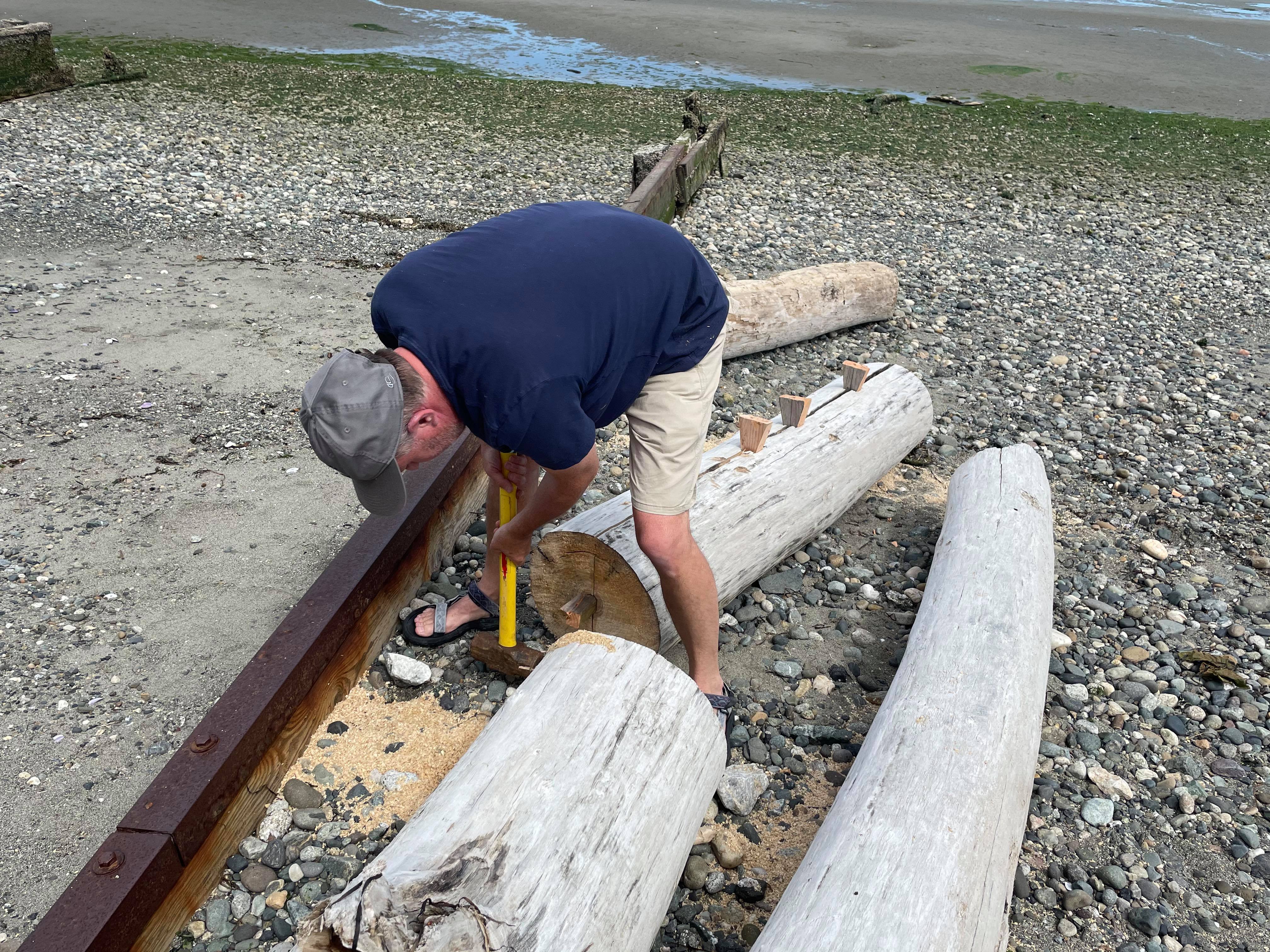 Splitting the long piece in half was a ton of fun. I cut wedges from a 2×4 and worked them down the log lengthwise, starting from a natural check at one end. The force generated by these simple machines is outrageous. The only bummer was a secondary mid-sized crack that opened up along the length, but it didn’t impact the integrity of the piece. I reinforced it with a few long screws anyways, and after the wood dries a bit more I’ll fill it with Check Mate to keep rot from setting in over the wet season.
