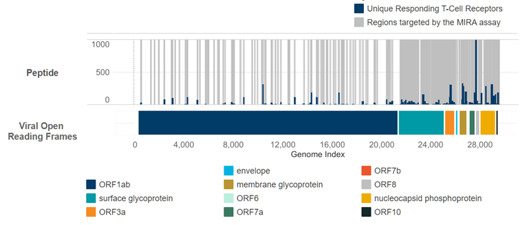 Above the ORF bars is the actual data. The grey areas represent parts of the genome that were “covered” by peptides tested with the MIRA assay. Covering the genome 100% would be cost-prohibitive, so Adaptive used every resource they could find to generate a list of peptides that were likely to occur in nature and probe the most important parts of the virus. In particular you can see the near total coverage at the spike protein. The blue bars in this same area represent unique T-Cells that responded to each part of the virus.