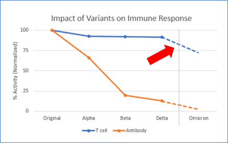 The blue line in the chart shows Adaptive’s best guess at what this impact will be — it’s a little more complicated that I imply above, but not much. It depends on the strength of each T-Cell response, and in some cases the overlap isn’t perfect and so some assumptions are required. At the end of the day, Adaptive calculates that we probably lose about 30% of the T-Cell response to Omicron vs. previous variants. Notably, they did this same analysis against the older variants, and the impact is far less.