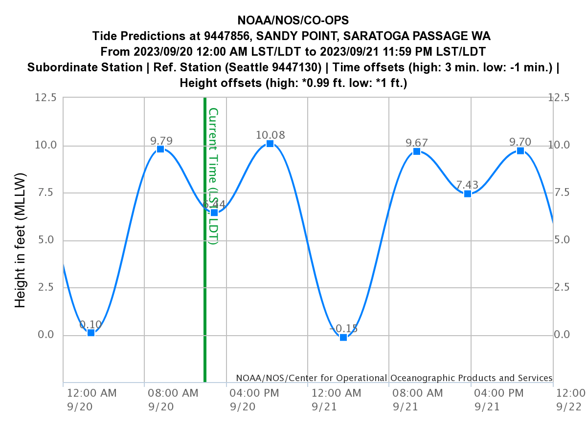 “Subordinate” stations (our closest is Sandy Point) have fewer historical measurements — just enough to compute differences from a primary station (Seattle in this case). But here’s the really interesting bit — most of these “stations” don’t actually have physical sensors at all! The Sandy Point buoy was only in place from February to April, 1977. In Everett, it was there for about five months in late 1995. To find an actual buoy you have to zoom all the way out to Port Townsend! This seems a bit like cheating, but I guess it works? Wild.