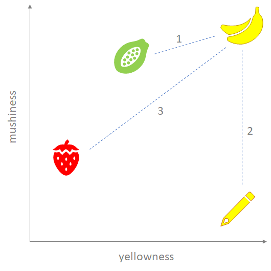 But things are never that simple — if you look a little more deeply, it’s hard to argue that the pencil is closer to a banana than the strawberry. So what’s going on? It turns out that a good vector metric needs to address three common pitfalls: