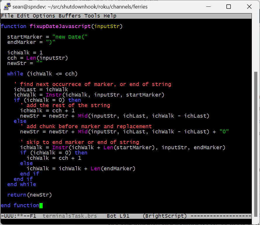 You may have deduced from this digression that the WSDOT JSON actually contains live JavaScript — and you’re right. Just a few Date constructors, but it’s enough to confuse the Roku JSON parser. The code in fixupDateJavascript is just good old grotty string manipulation that hacks it back to something parsable. This was actually a really nice time to have Hulu’s command-line brs tool available because I didn’t have to keep pushing code up to the Roku to get it right.